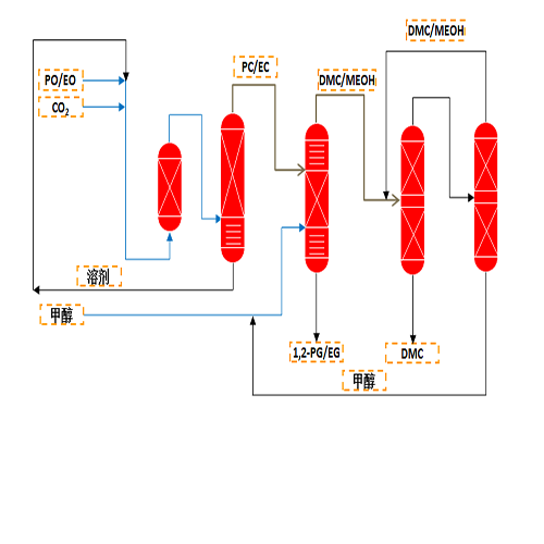 昊永化工發明了“低能耗、綠色碳酸酯產品生產方法和系統”的國家專利,開發的碳酸酯綠色生產工藝,使用酸-堿雙功能固體催化劑,替代了現在普遍采用的甲醇鈉均相催化劑,避免了均相催化劑的失活與回收問題,實現了綠色生產;采用熱泵精餾技術,實現能量的高效利用;并在EC精制部分使用連續結晶工藝,從而降低了EC精制部分的能耗,具有工藝技術先進,三廢少,能耗低,產品質量穩定等優點,綜合性能達到國際先進水平。