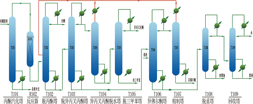 針對異佛爾酮的生產現狀 , 我公司與中國石油大學(華東)聯合開發了丙酮直接縮合的氣固催化合成技術,該工藝以先進的丙酮氣相催化縮合反應技術為基礎 , 采用共沸與萃取精餾分離技術分離反應產物,得到異丙叉丙酮、均三甲苯和異佛爾酮產品,填補了國內技術空白。