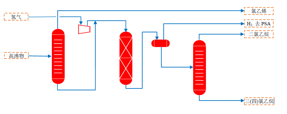 采用烯烴飽和加氫技術對聚氯乙烯高沸塔底釜液進行加氫處理,將二氯乙烯和三氯乙烯加氫轉化為二氯乙烷和三氯乙烷,對加氫產物進行精餾處理進而得到高純度的二氯乙烷和三氯(四氯)乙烷。