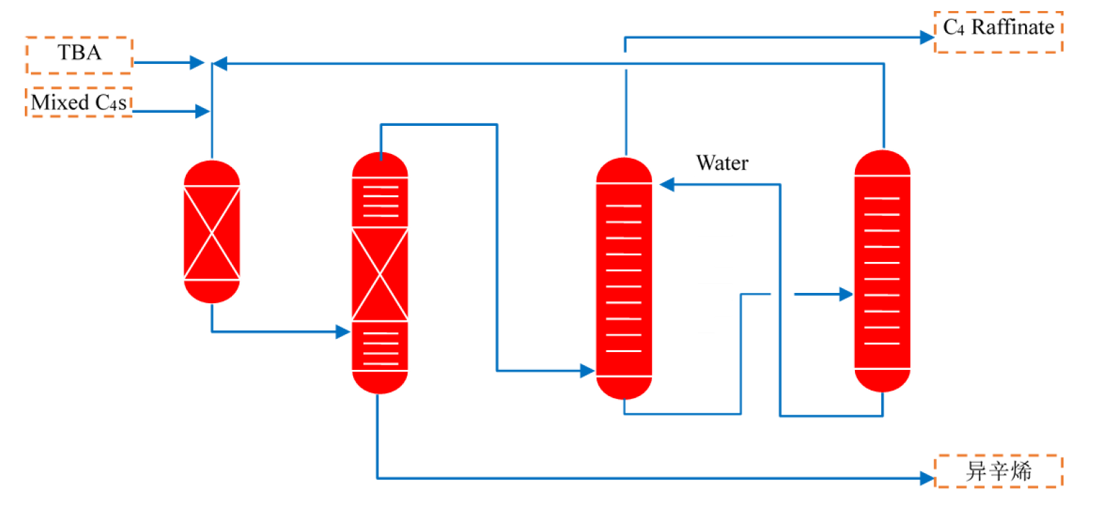 異辛烯是異丁烯二聚疊合產物。此技術采用固定床反應、催化精餾塔與TBA助劑回收三段工藝構成。固定床和催化精餾塔內裝填的催化劑為酸性離子交換樹脂。TBA回收采用先進的水洗精餾回收技術。